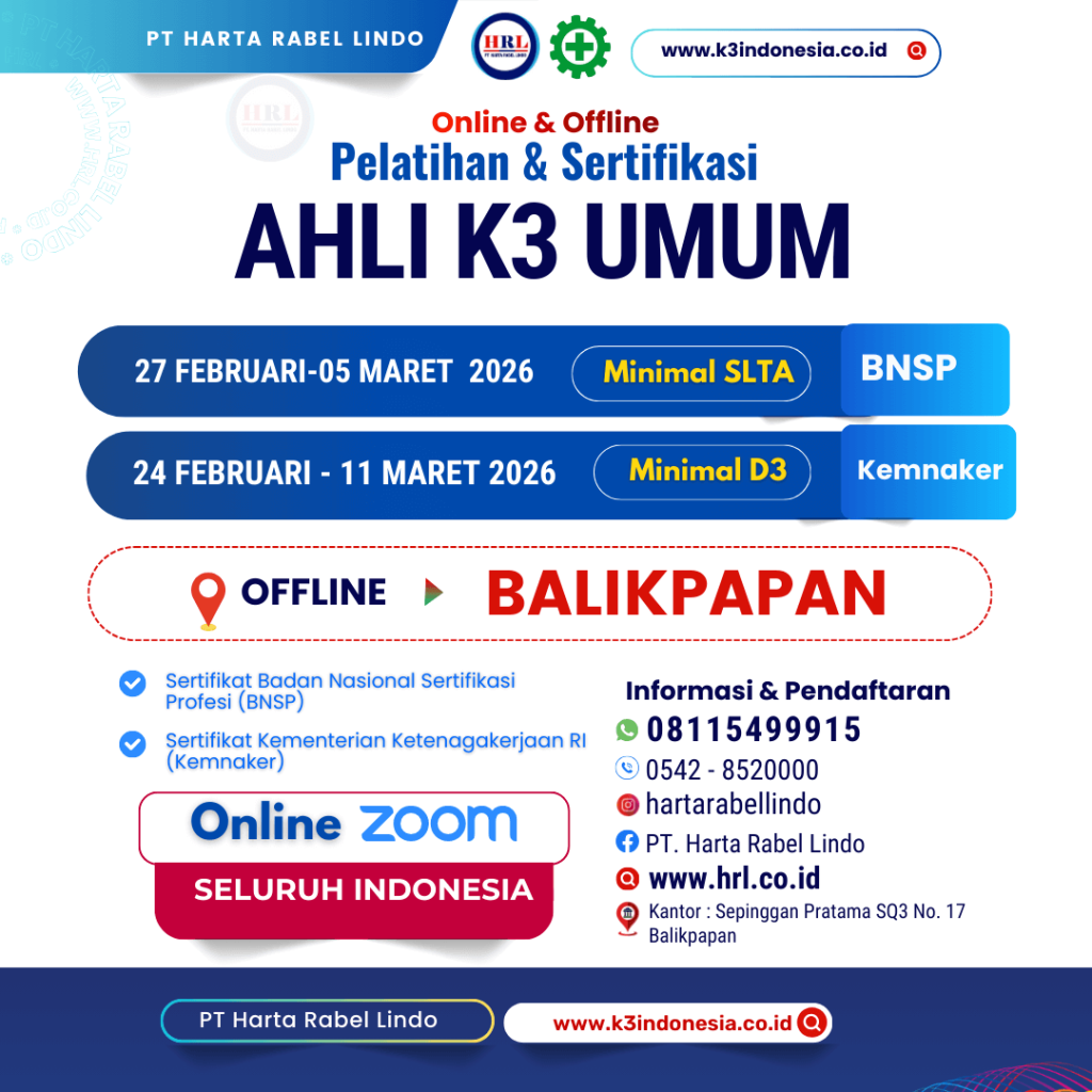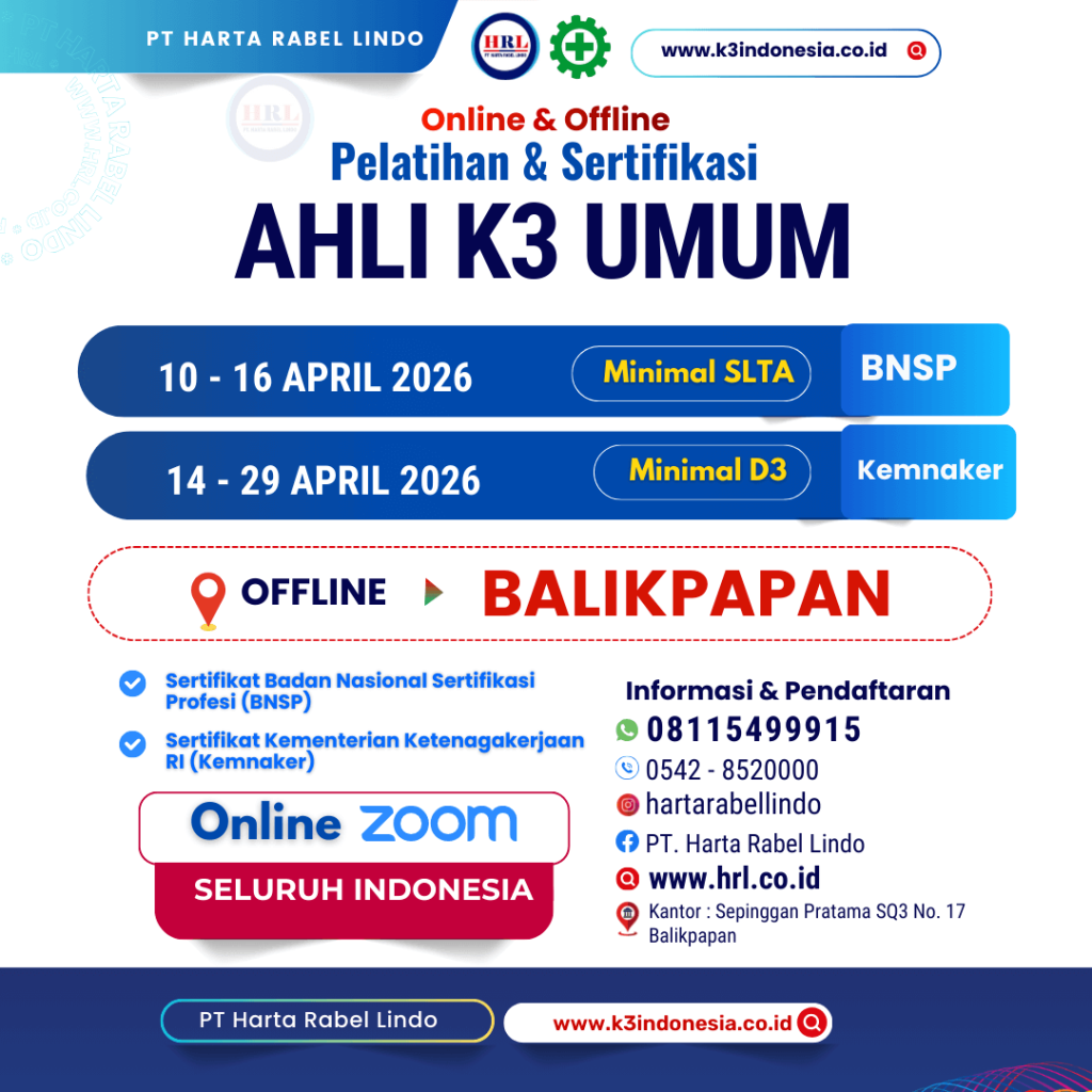 Pelatihan dan sertifikasi Ahli K3 Umum Kementerian Ketenagakerjaan Republik Indonesia (Kemnaker RI) dan Badan Basional Sertifikasi Profesi (BNSP).